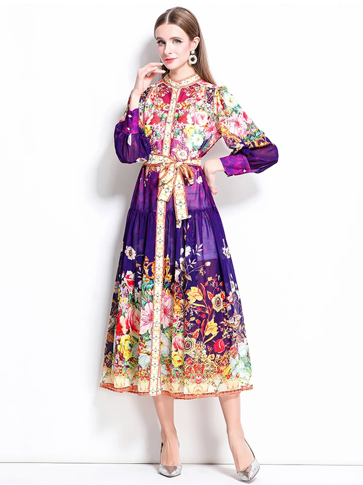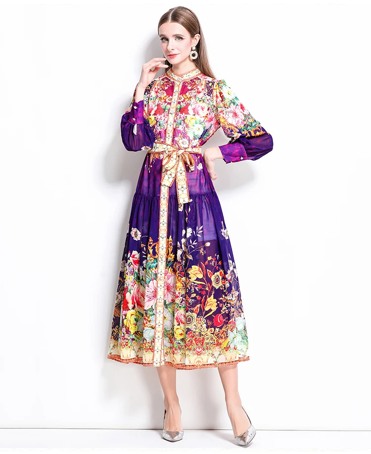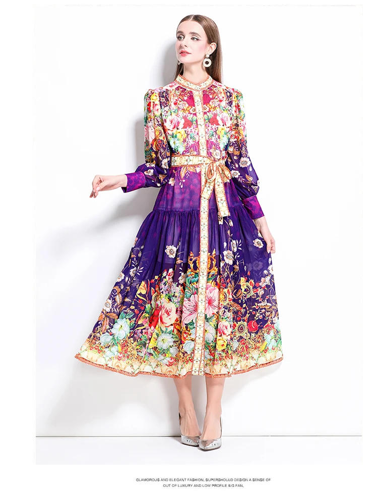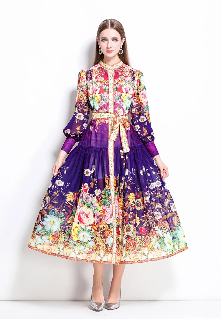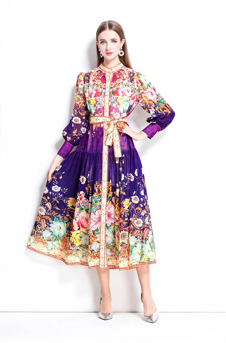 ZAROY 2025 Newest Luxury Women Midi Dresses Vintage Floral Print Stand Collar Lantren Sleeve Long Dress Elegant Party Vestidos
