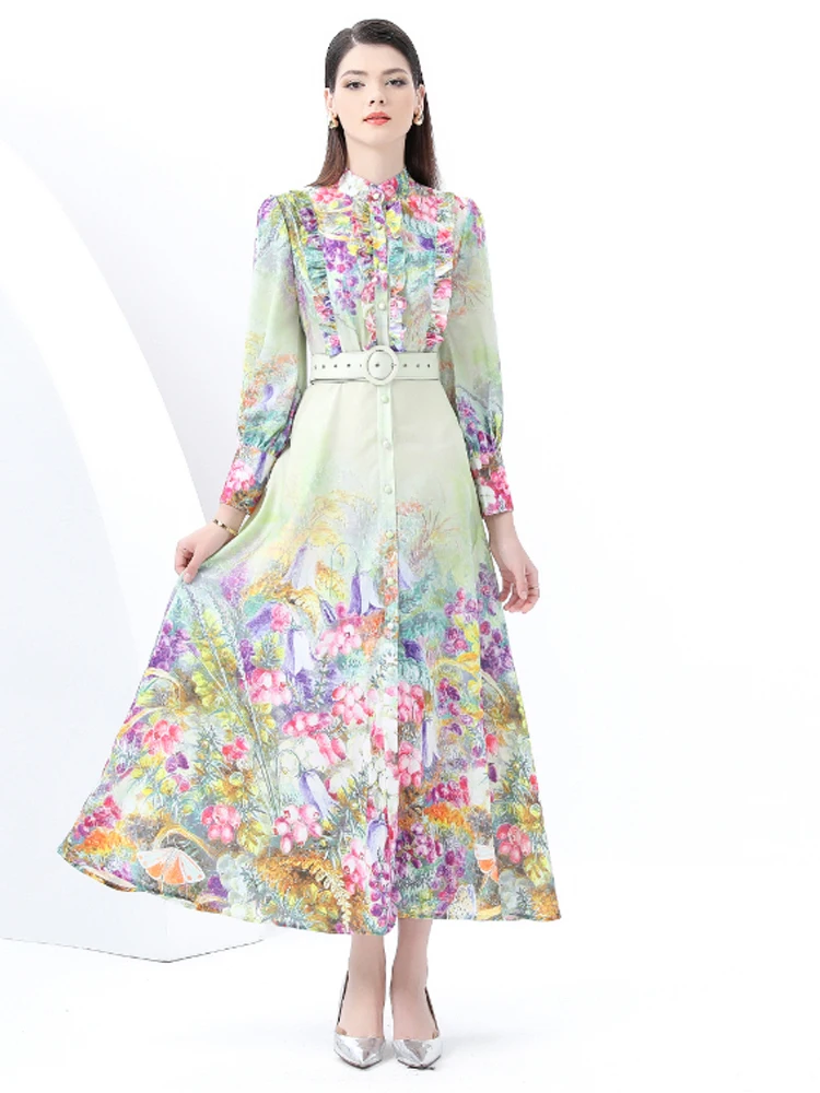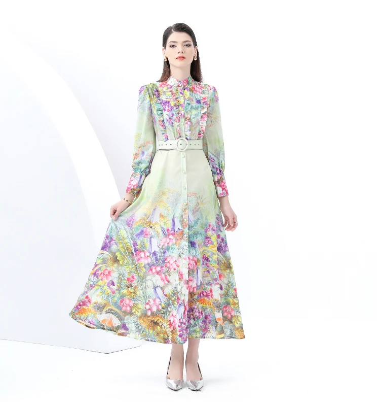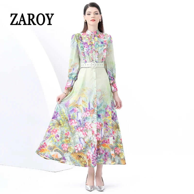 ZAROY Flower Print Maxi Dress Women Holiday Clothing Long Sleeve Stand Collar Belt A-line Long Dress Luxury Robes Vestidos