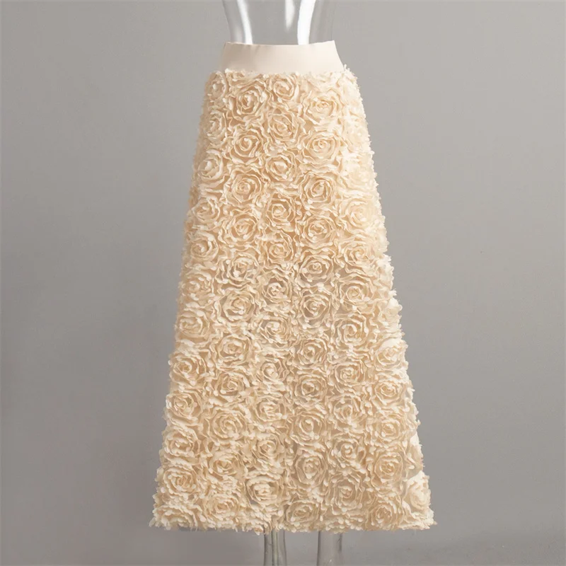 - D Floral White Skirt Women A-line: Three Dimensional Flower Mid-calf Skirt