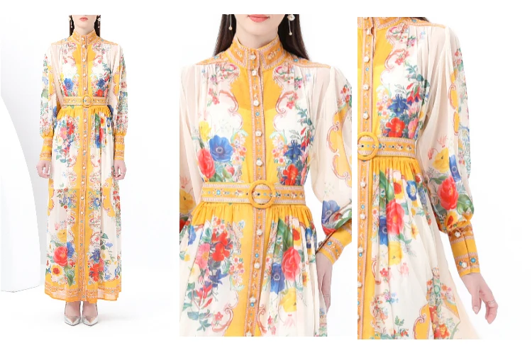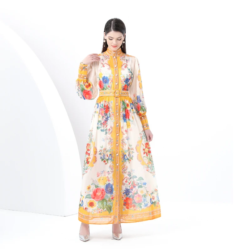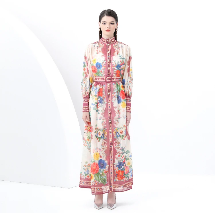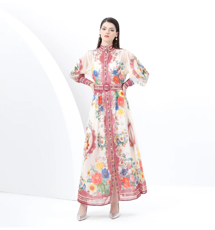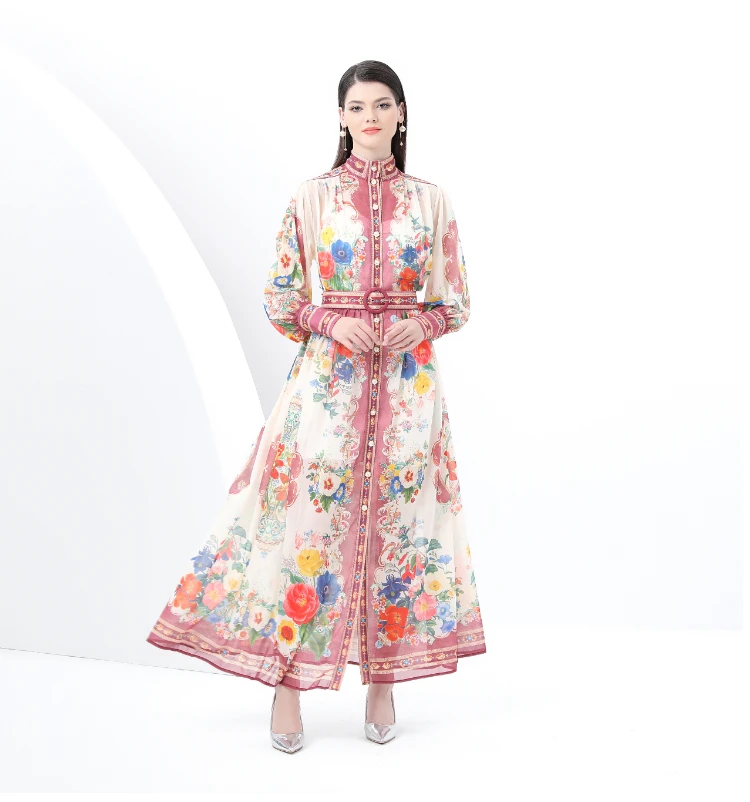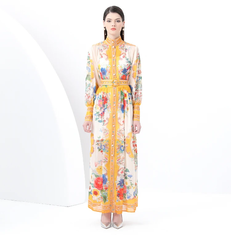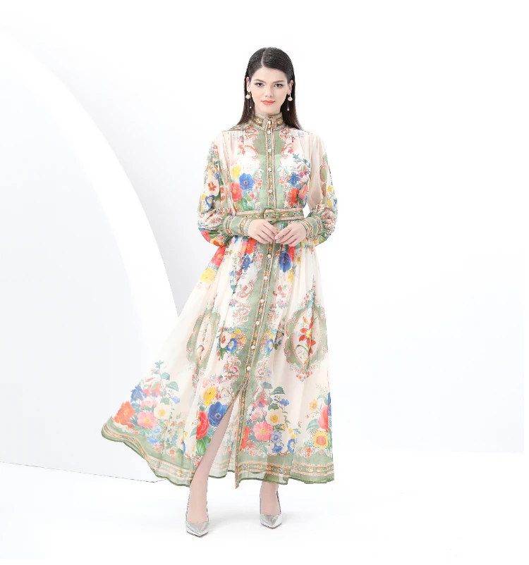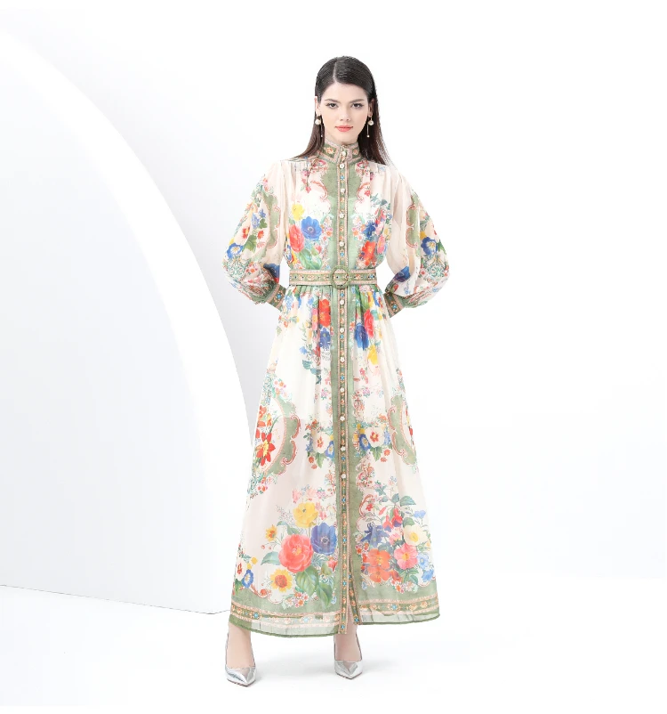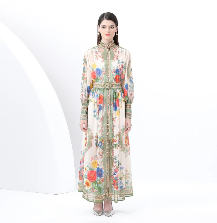 ZAROY Luxury Runway Maxi Dress Women Stand Collar Long Sleeve Single Breasted Floral Print Belt Long Boho Party Robe Vestidos