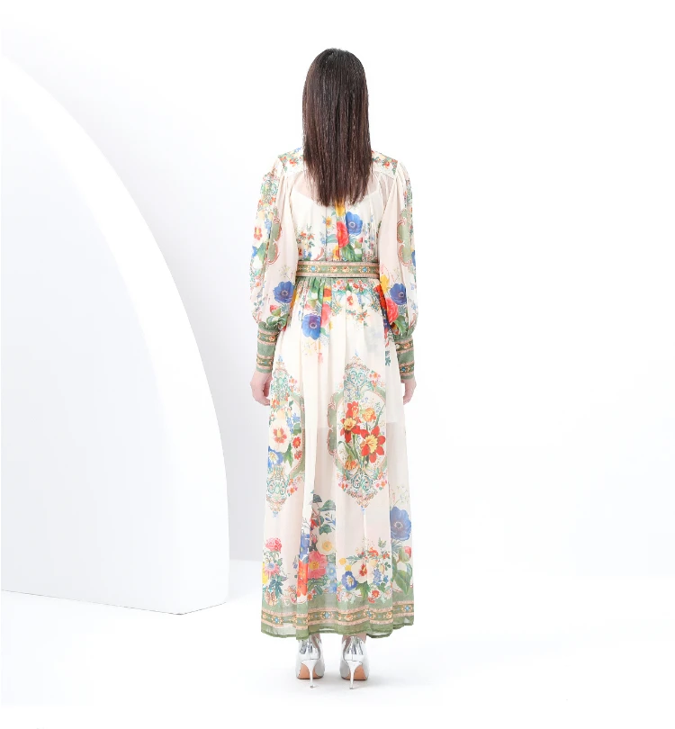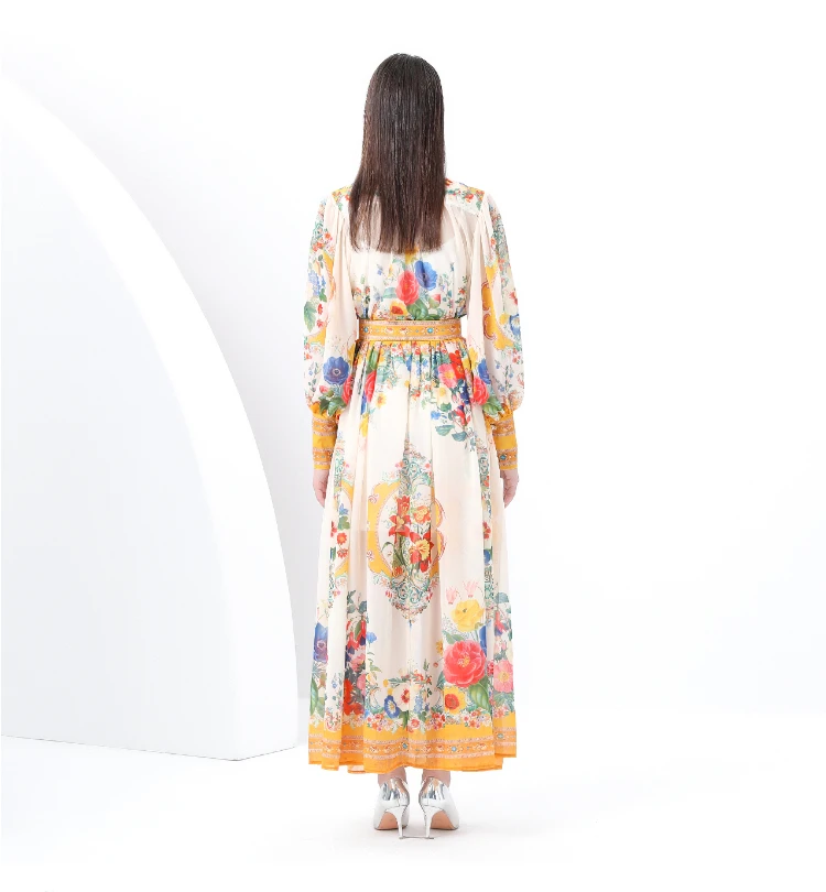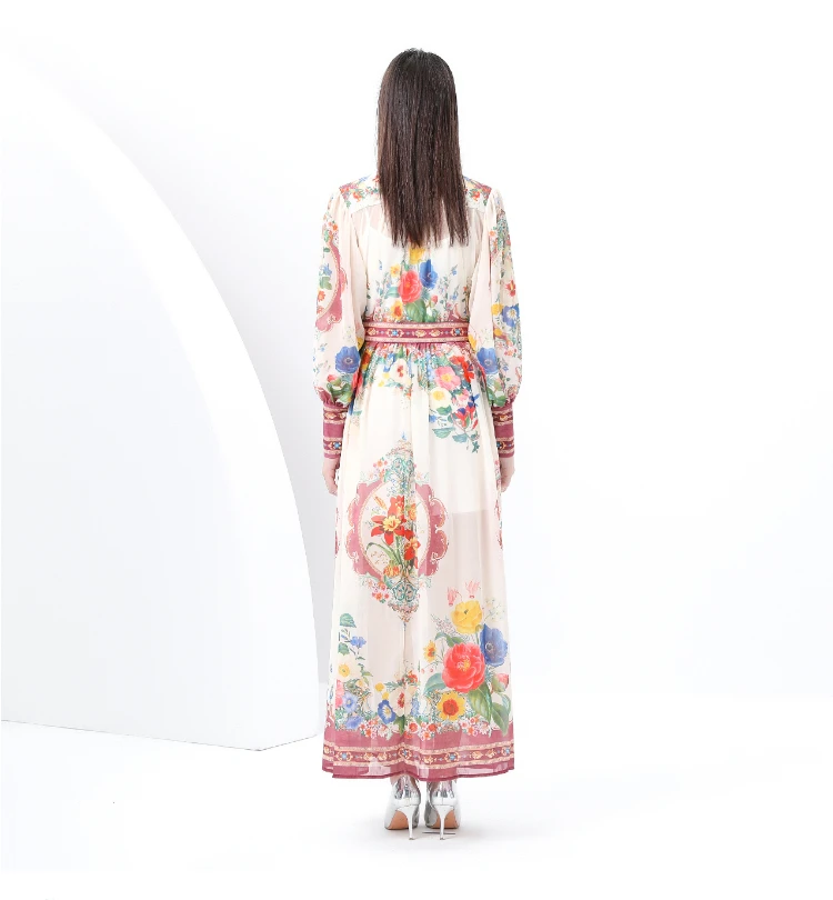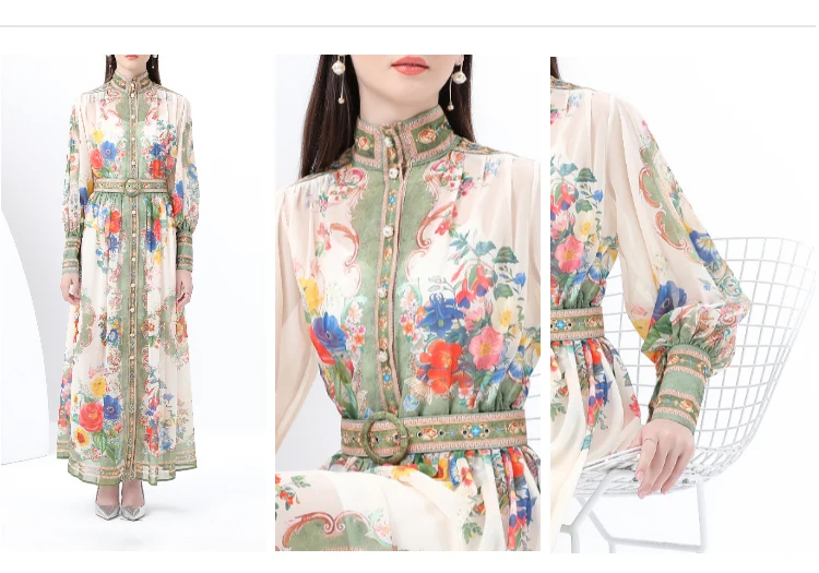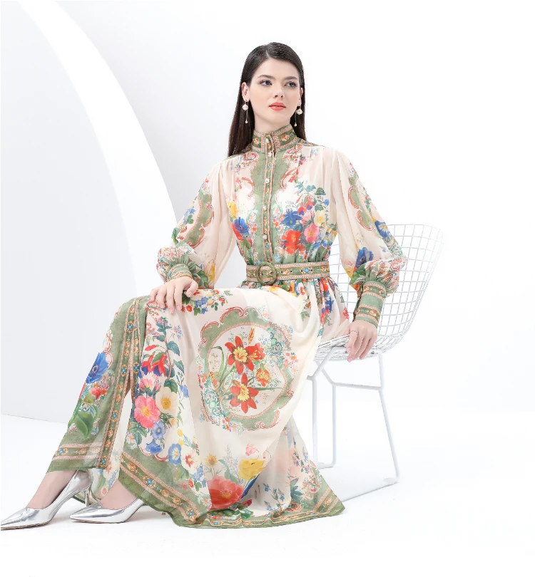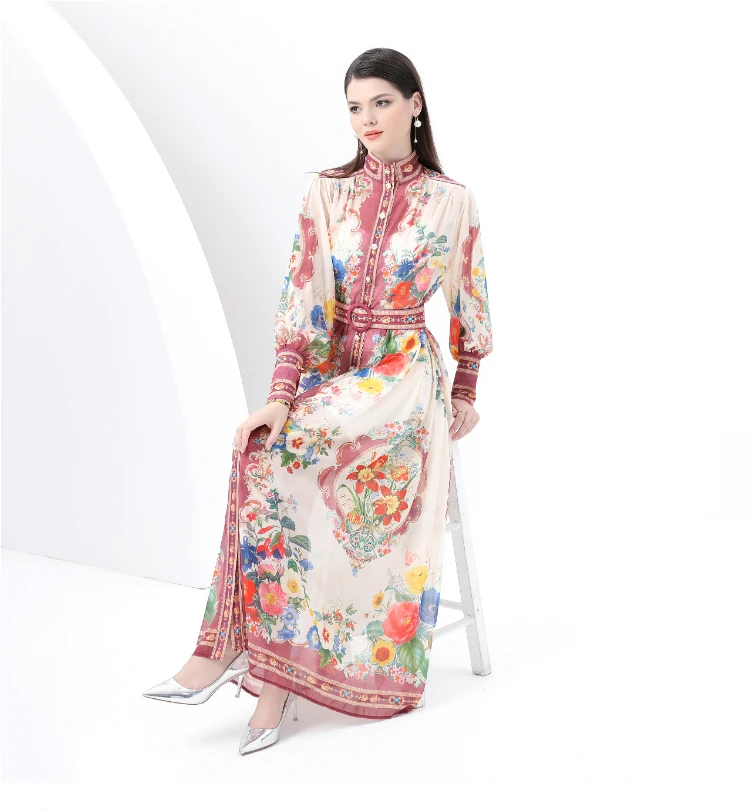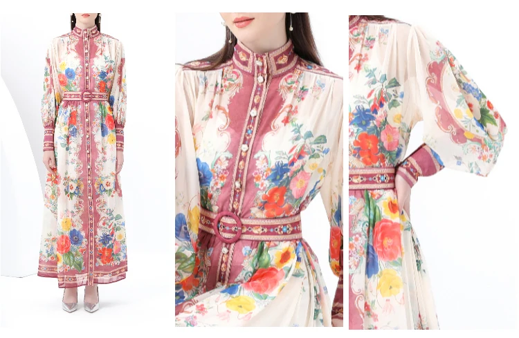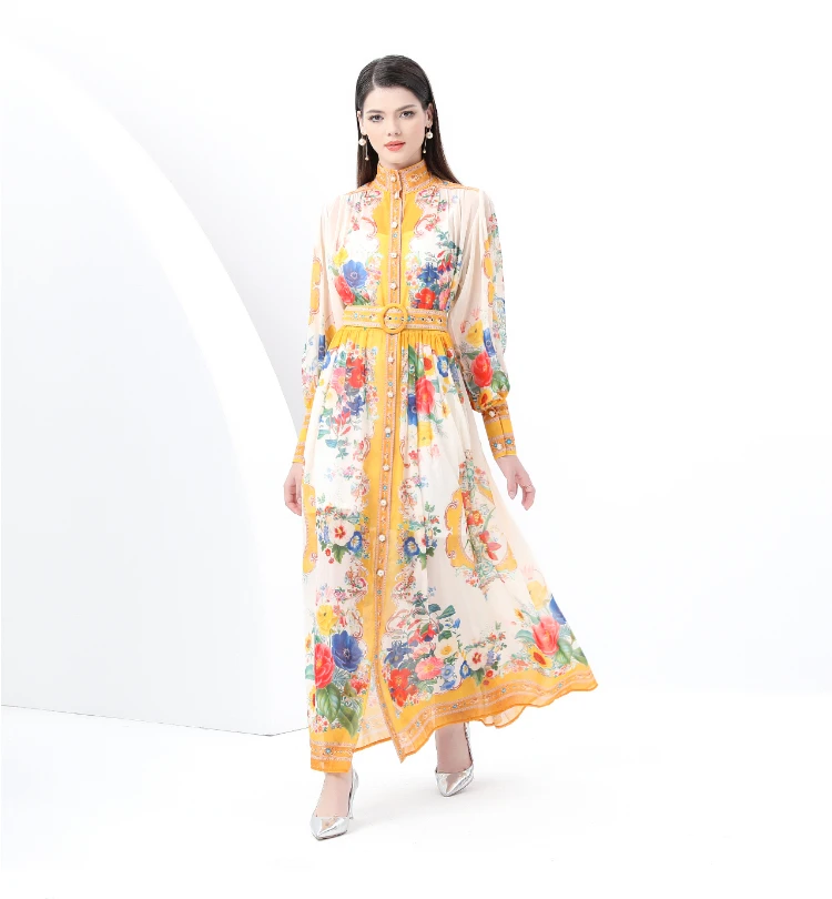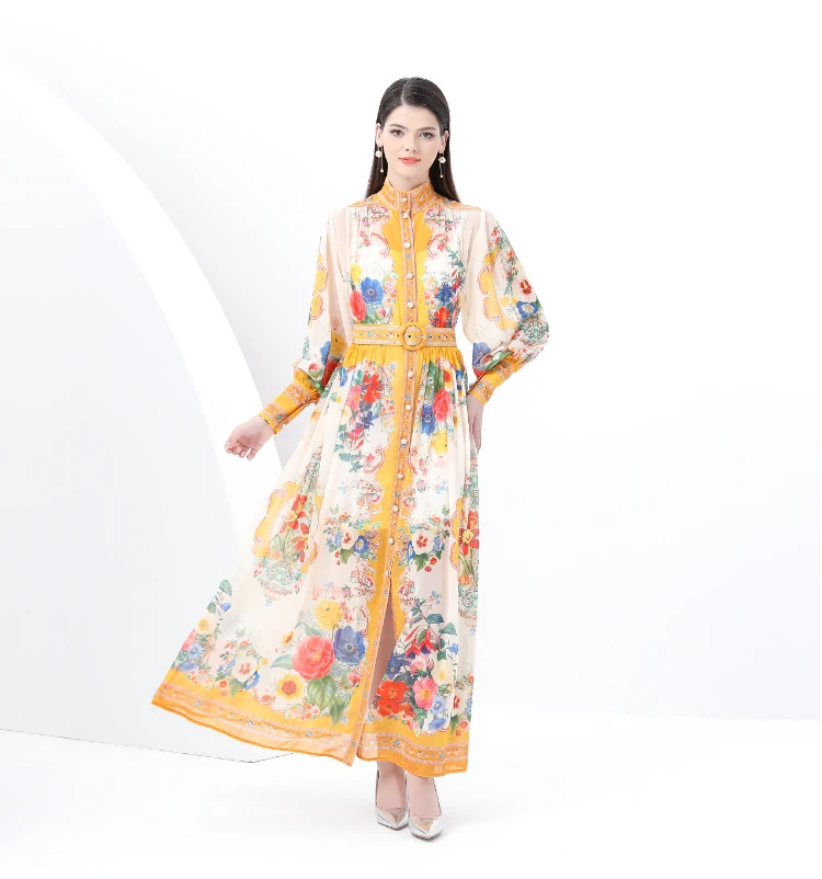 ZAROY Luxury Runway Maxi Dress Women Stand Collar Long Sleeve Single Breasted Floral Print Belt Long Boho Party Robe Vestidos
