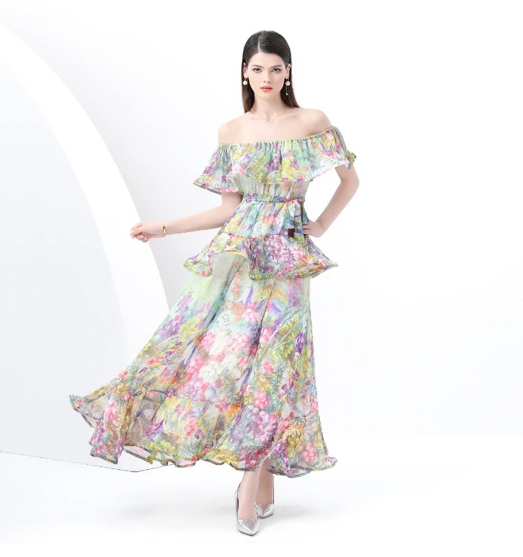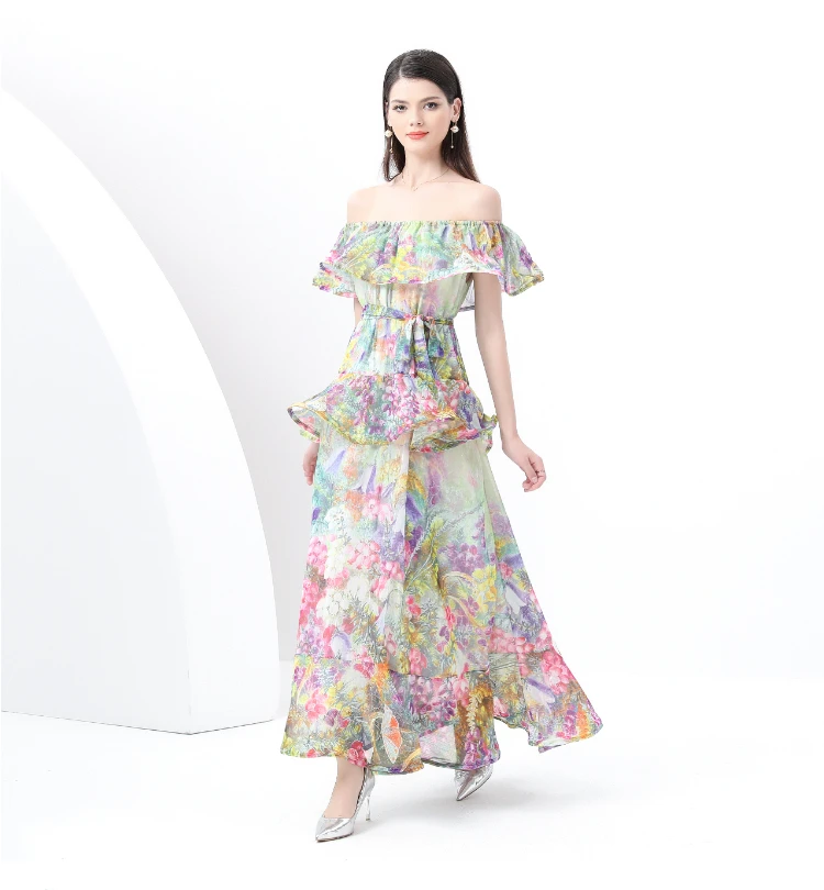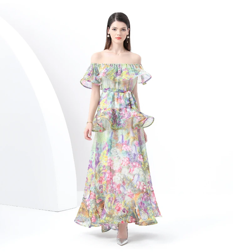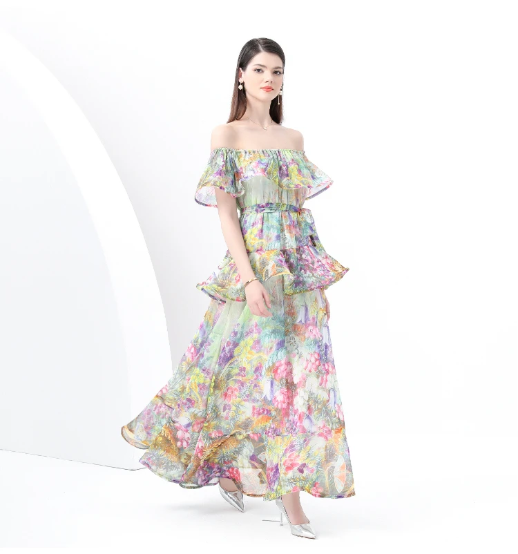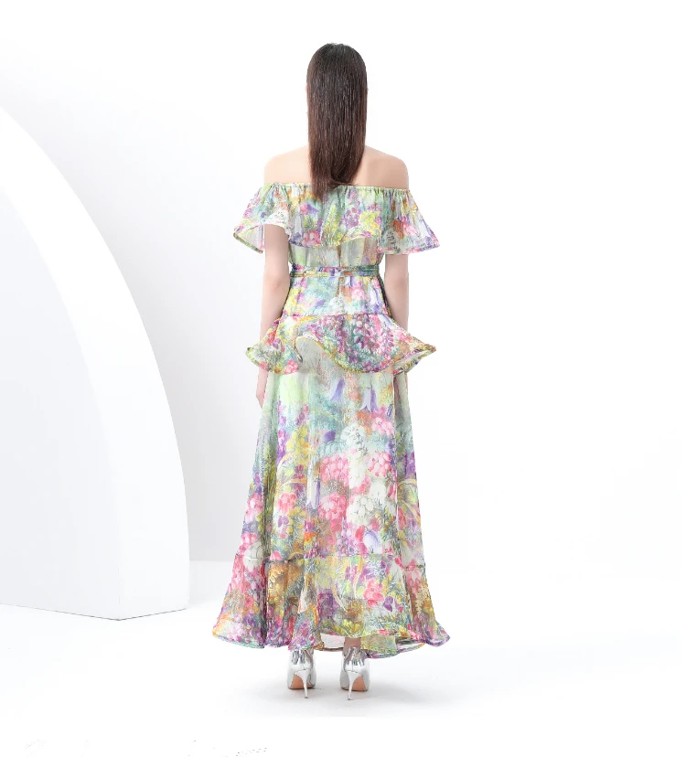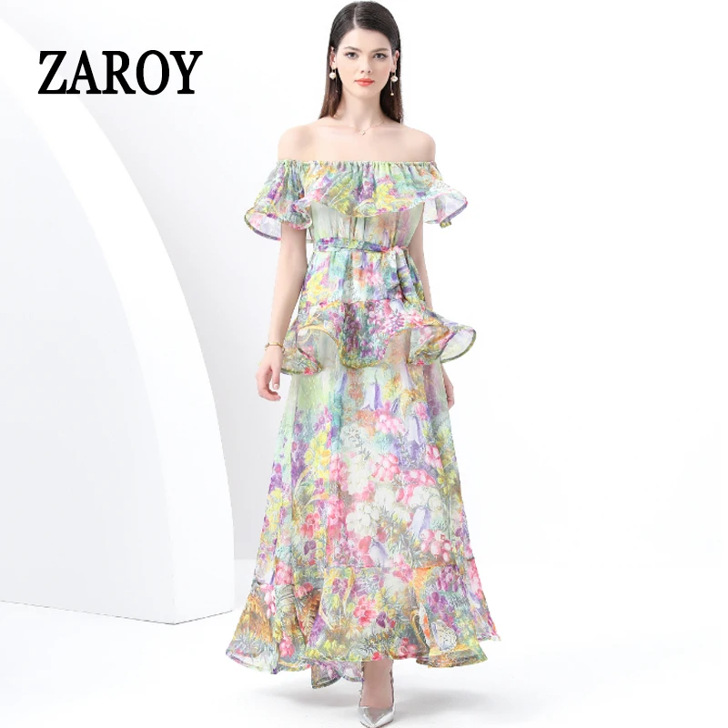 ZAROY Ruffle Flounce Luxury Long Party Dress Women Trendy Floral Printed Evening Gowns Sexy Slash Neck Elegant Summer Vestidos