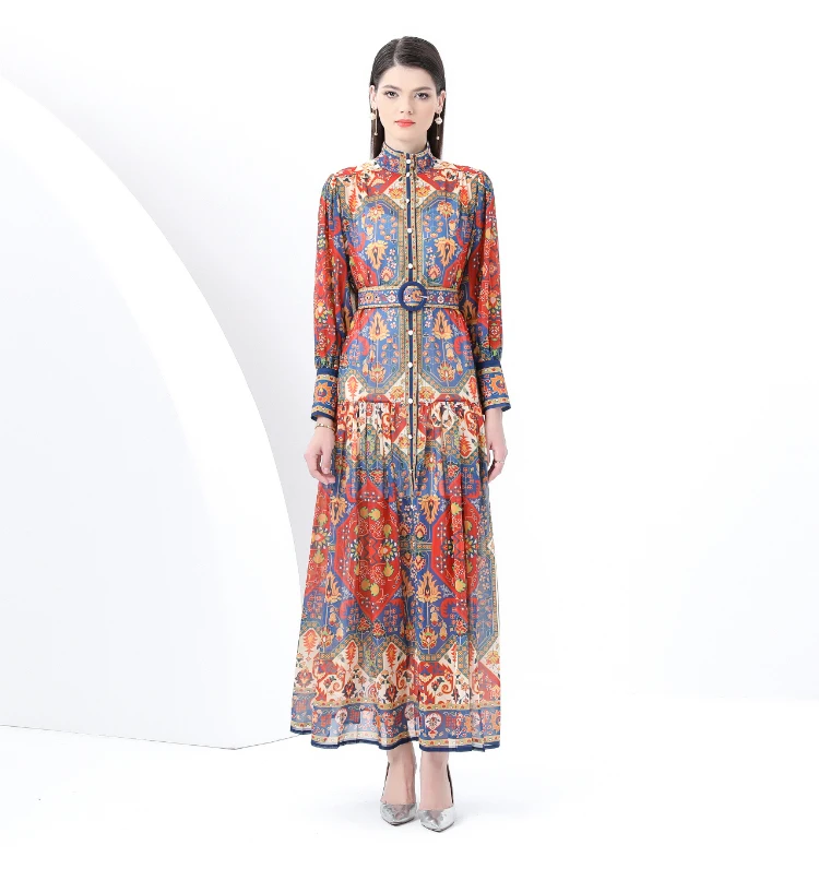 ZAROY Vintage Boho Print Lantern Sleeve Maxi Dress Buton-up A-line Print Belted Luxury Long Dress Elegant Party Vestidos שמלה