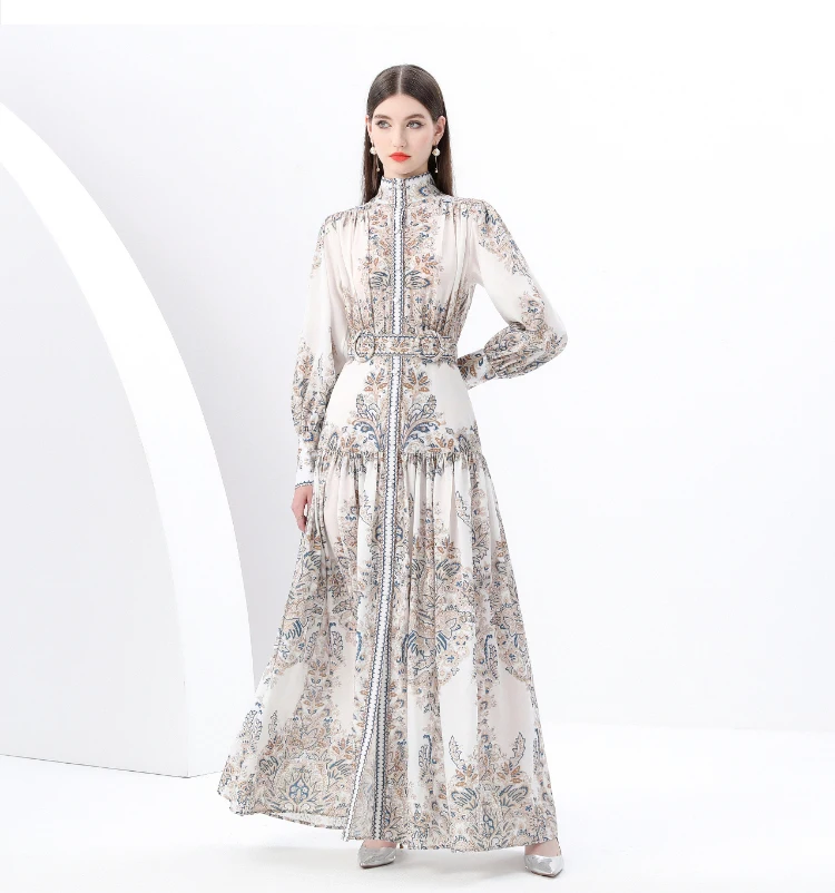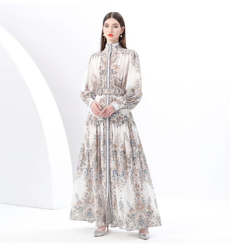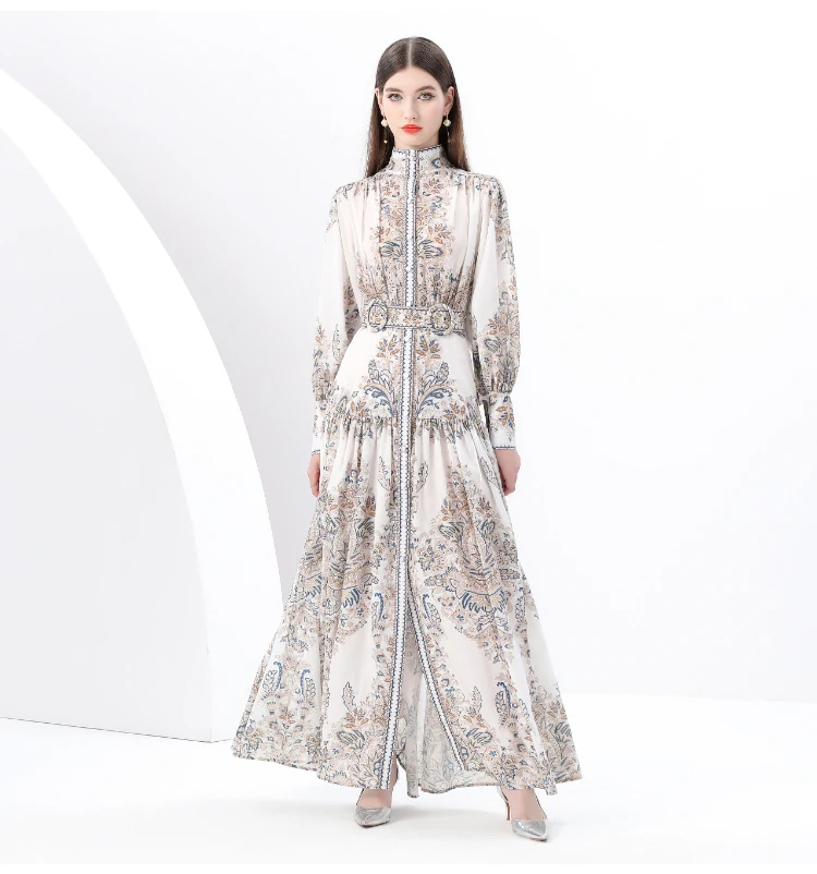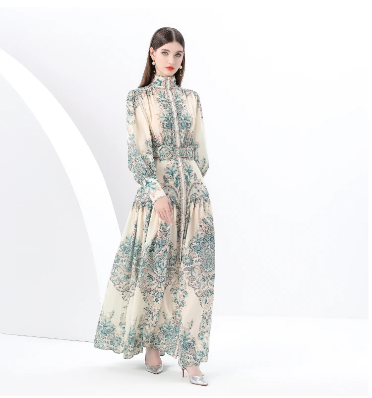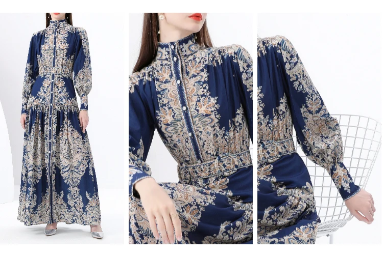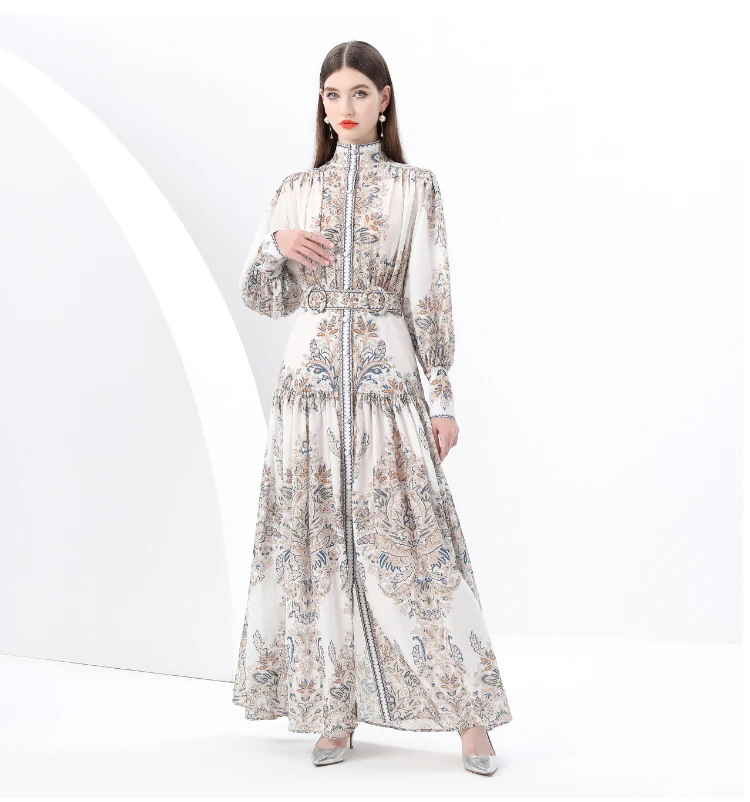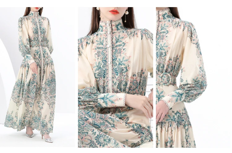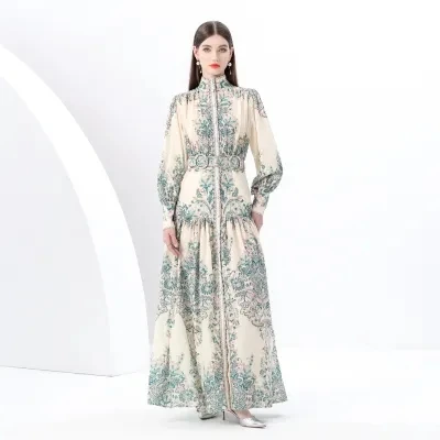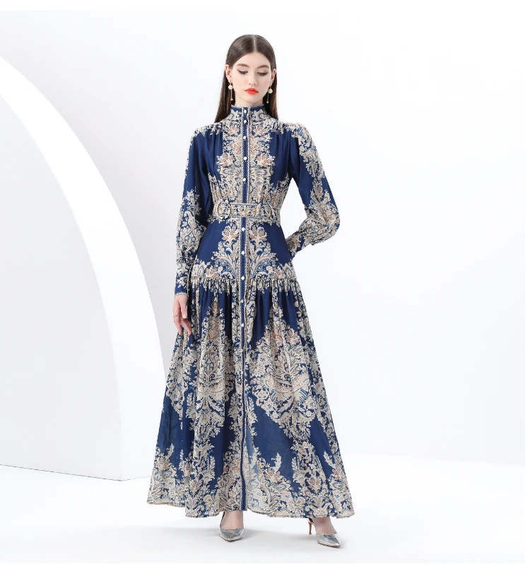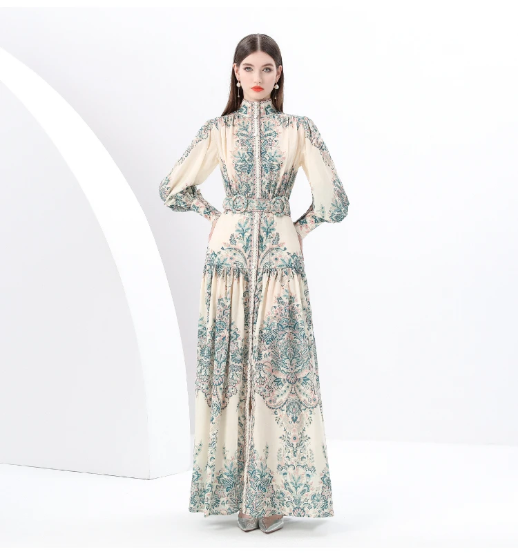 ZAROY Vintage Luxury Print Women Maxi Dress Long Sleeve Stand Collar Single-breasted Long Dress Party Robe Vestidos فساتين سهرة
