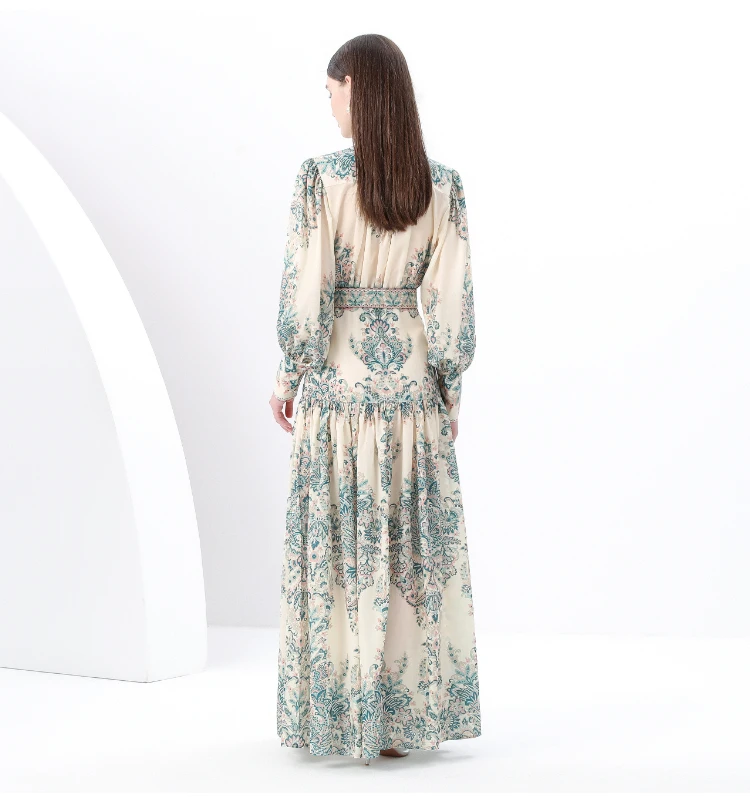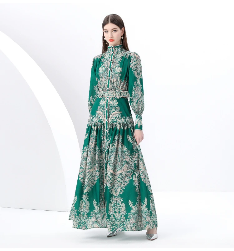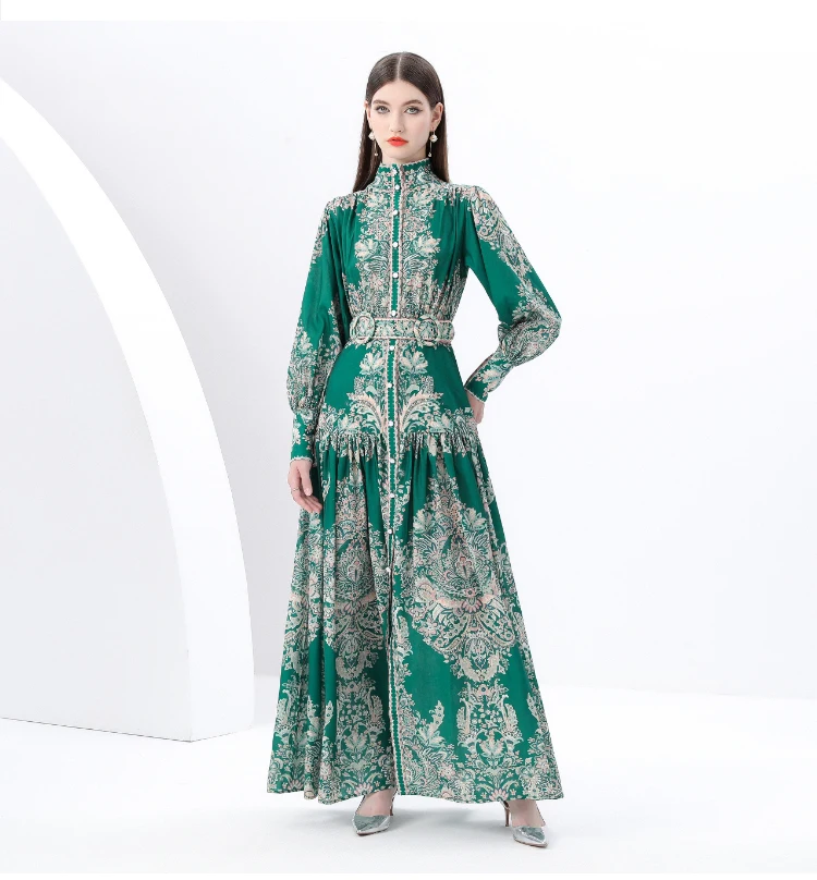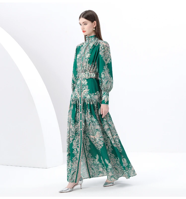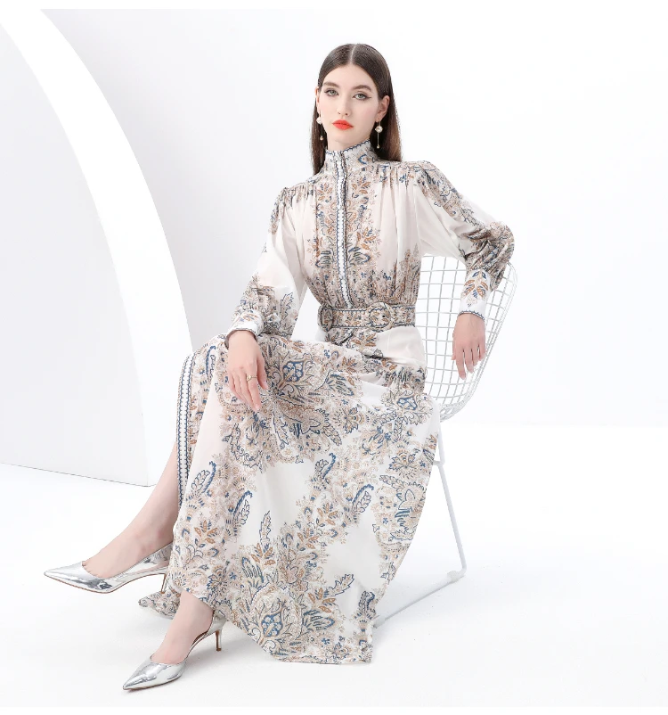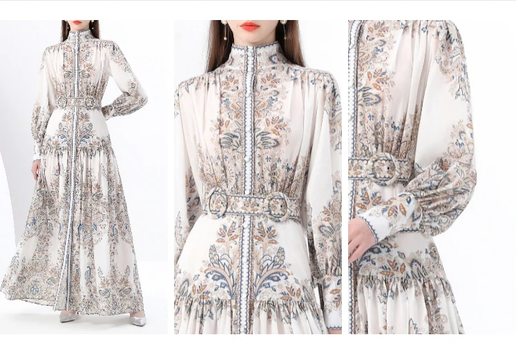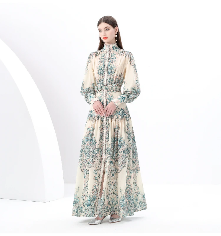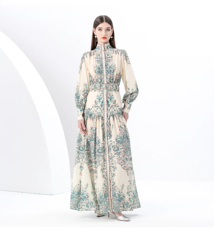 ZAROY Vintage Luxury Print Women Maxi Dress Long Sleeve Stand Collar Single-breasted Long Dress Party Robe Vestidos فساتين سهرة